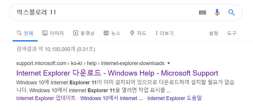 구글에서 '익스플로러 11'을 검색하고